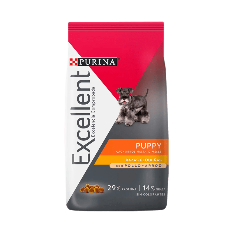 PURINA® Excellent® CACHORROS POLLO Y ARROZ RAZAS PEQUEÑAS ofrece una fórmula completa y balanceada a base de proteínas de alta calidad,incluyendo tocoferoles mezclados -fuente de vitamina E- y sin colorantes ni saborizantes artificiales, para garantizar la calidad nutricional de sus fórmulas y un sabor único e irresistible.
