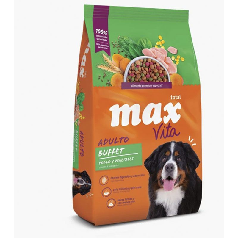 ALIMENTO ESPECIAL IDEAL PARA ADULTOS DE TODAS LAS RAZAS. Alimentación 100% balanceada y llena de ingredientes para que la nutrición de tu peludo sea completa, con una excelente digestibilidad que hace que las heces sean firmes y sin olor. Con Total Max Vita tu perro adulto estará siempre activo para disfrutar cada momento. Prebiótico y extracto de yuca que reducen el olor de las heces. Niveles adecuados de proteína y ômega 6 para una piel saludable y pelo brillante. Reducción en la formación de sarro dental y limpieza de los dientes gracias a la crocancia del alimento.