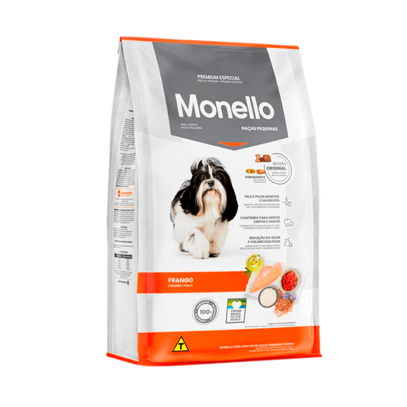 ALIMENTO PREMIUM ESPECIAL IDEAL PARA RAZAS PEQUEÑAS. Este alimento a base de pollo proporciona más longevidad a los peludos. Con adición de linaza, aceite de oliva y aceite de girasol, el alimento es rico en antioxidantes que combaten los radicales libres y previenen el envejecimiento, lo cual aumenta el bienestar y la vitalidad de las mascotas. Los ingredientes también son esenciales para promover la belleza y la salud de la piel y del pelo de los perros. Manteniendo su fórmula original, se le agregó la levadura de cerveza y manano-oligosacáridos (MOS), prebiótico que actúa en la salud intestinal, lo cual asegura una excelente absorción de los nutrientes. Aliado al extracto de Yucca Schidigera, proporciona un ambiente más higiénico, ya que actúa en la reducción del volumen y del olor de las heces. Los nuggets rellenos siguen haciendo parte del paquete de Monello Razas Pequeñas, ya que dejan las comidas más atractivas y sabrosas. Proteína Cruda (mín.) 240g/kg (24%), Lípidos (mín.) 120g/kg (12%), Fibras (máx.) 30g/kg (3%), Materia Mineral (máx.) 90g/kg (9%), Calcio (mín. / máx.) 10g/kg – 22g/kg (1,0 – 2,2%), Fósforo (mín. / máx.) 8000mg/kg – 16g/kg (0,8 – 1,6%), Sodio (mín.) 2000mg/kg (0,2%), Omega 3 (mín.) 3000mg/kg (0,3%), Omega 6 (mín.) 30g/kg (3%), Saponina (mín.) 10mg/kg, Vitamina E (mín.) 200UI/kg, Vitamina C (mín.) 100mg/kg, Zinc (mín.) 130mg/kg, Selenio (mín.) 0,35mg/kg, Humedad (máx.) 100g/kg (10%).